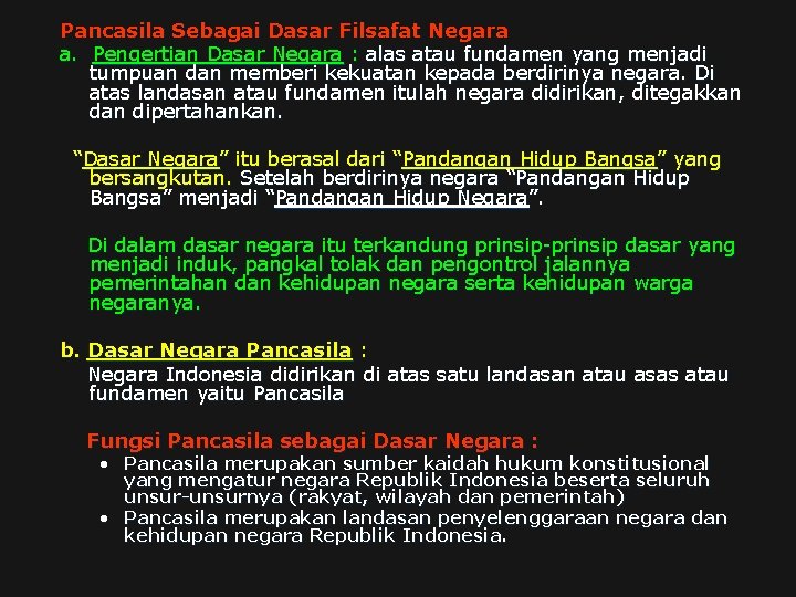 Untuk mengatur tatanan kehidupan bangsa indonesia dan negara indonesia, yang mengatur semua pelaksanaan sistem . Pancasila sebagai dasar negara republik indonesia ditetapkan pada tanggal 18. Konvensional sebagai dasar filsafat negara pada hakikatnya merupakan suatu sumber nilai bagi bangsa dan negara indonesia. Pancasila merupakan jiwa dan kepribadian bangsa indonesia. Dasar negara indonesia adalah pancasila, terdiri dari lima sila yang menjelaskan tujuan negara indonesia berdiri.